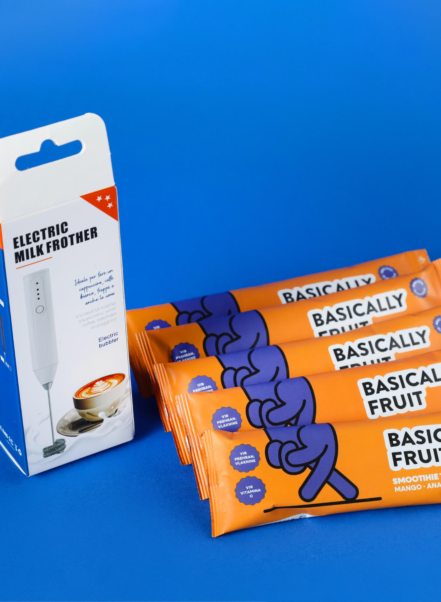 V paketu: 6× Smoothie Tropical Berry & 1× Mini Mixer
